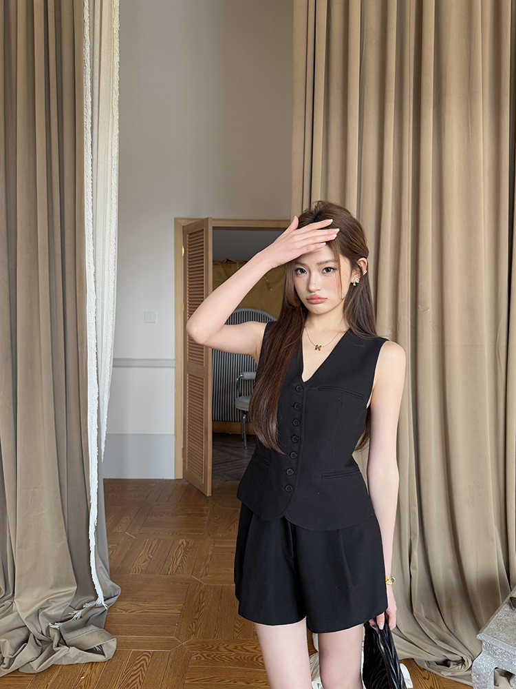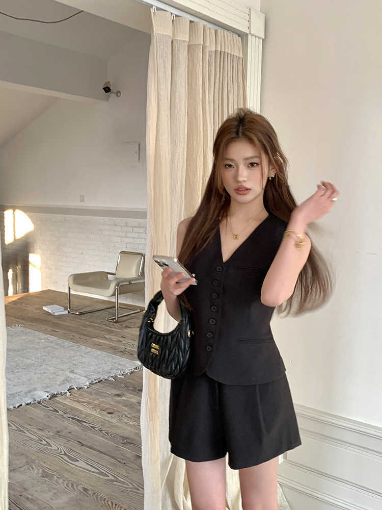 Black V-neck Top Suit Women's Vest Shorts Casual Suit