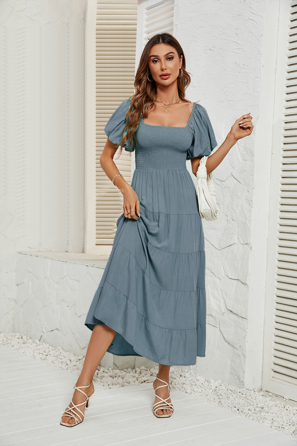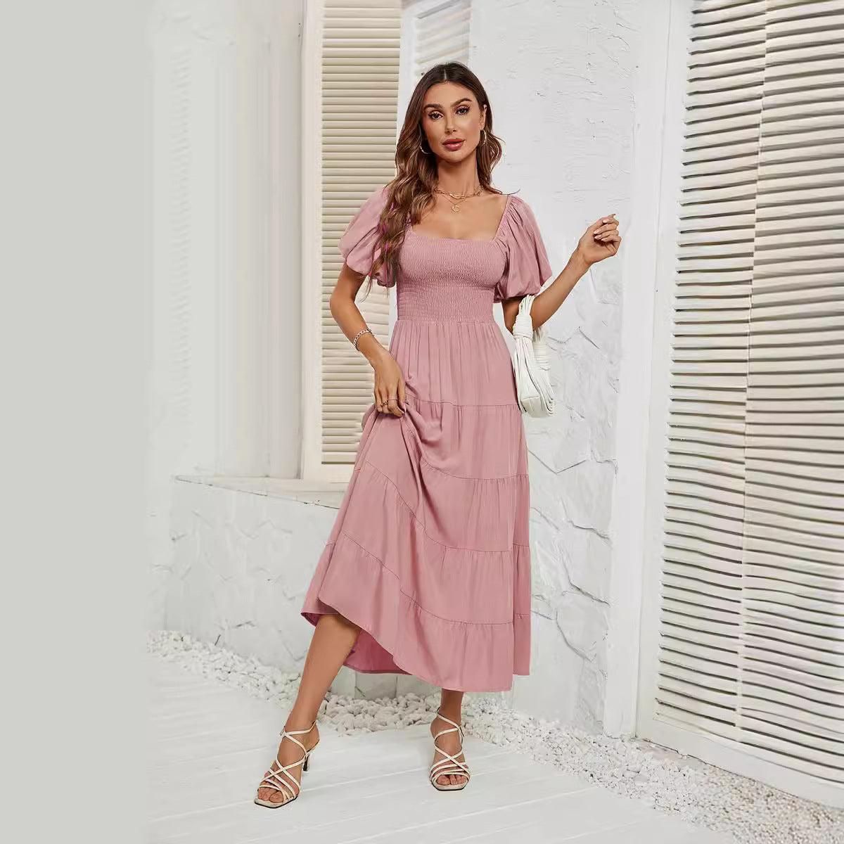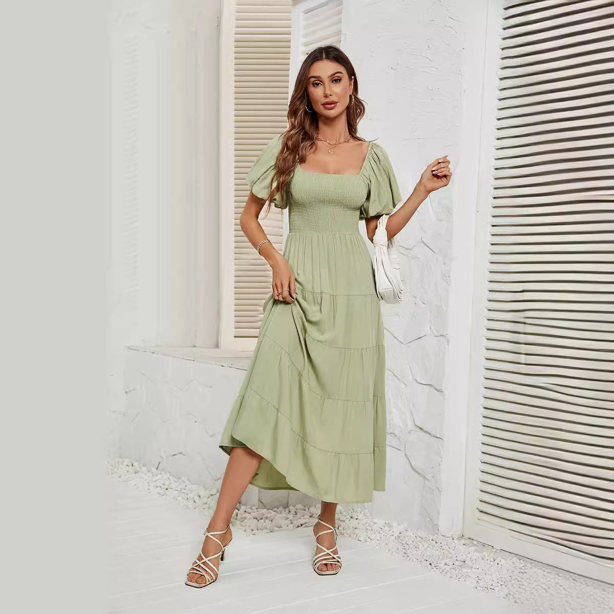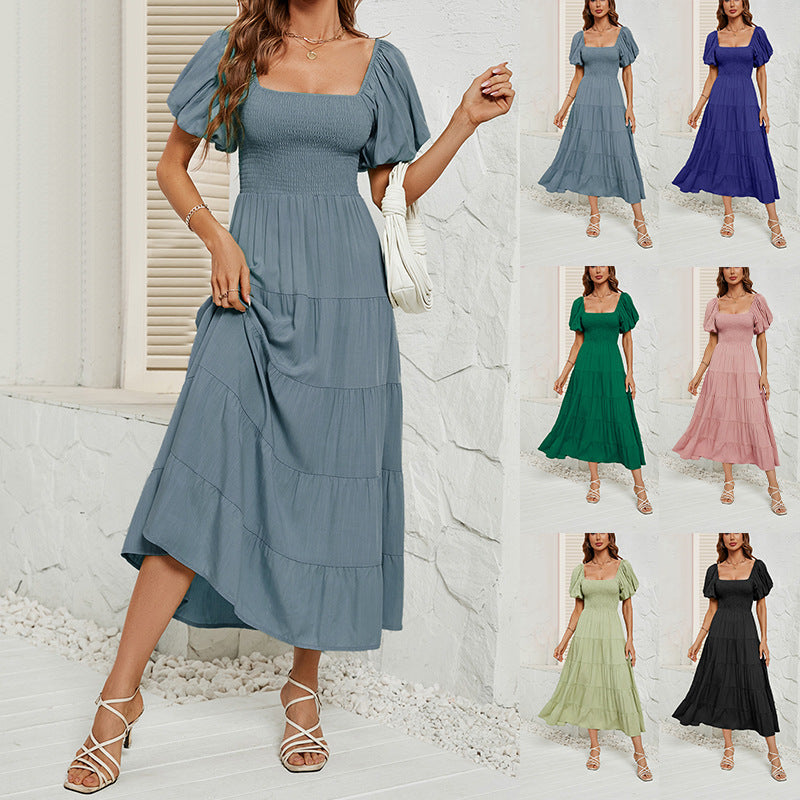 Summer Square Collar Backless Puff Sleeve Dress Women